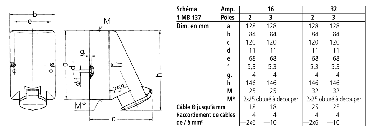 avec support de contacts à haute tenue thermique, contacts nickelés, fixations intérieures, entrée de câble 1 x par le haut, 2 x entrée obturée (défonçable) en bas, l’embase peut être tournée de 180°