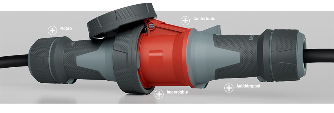 Nos connecteurs sont équipés d‘une aide à l’ouverture Intégrée au niveau du prolongateur qui vous permet d’ouvrir et de tenir confortablement le couvercle rabattable. Les connecteurs sont également équipés d’une fermeture à rotation entre la partie avant et le couvercle, permettant un verrouillage rapide et en toute sécurité sans vis. Pour les fiches et prolongateurs 63 et 125 A (indice de protection IP67), les joints sont également moulés dans le couvercle du prolongateur et dans la partie avant de la fiche – et donc absolument imperdables.