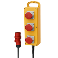 Distributori di corrente portatili in plastica o gomma piena. Disponibili in diverse versioni da 16 A, protetti da polvere e acqua secondo la classe di protezione IP44.